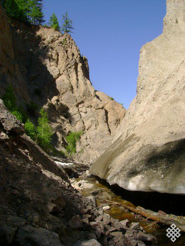 Легенд, связанных с достопримечательным местечком множество. Есть одно предположение: когда прятали от местных глаз могилу Чингиз-Хана по горам Танну-Ола, начались менять русла рек и сделали слияния двух речек. Одна из таких речек и бежит сейчас по дну этого каньона. Так вот ей сильно не понравились новые берега, и она стала все чаще выходить из них, возмущаться. Размыла русло так, что теперь бежит на такой глубине, где в сорокоградусную жару лед не тает — довозмущалась...