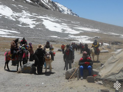 Большинство паломников составляли тибетцы. Они были будто сложены для гор: стройные и легковесные. Мужчины и женщины, с детьми на закорках, даже за руку. В большинстве своем они были одеты в шубы с крытым верхом темного цвета из овечьей, ягнячьей шкур. А шубы были точь-в-точь, как у тувинцев. У женщин же верх шуб иногда был разноцветным, на шее было много разных бус, а на пальцах серебряных перстней. Лица они закрывали либо масками или кончиками платков на голове. За спинами у них были в основном мешки, по всей видимости, с продуктами. В руках же бамбуковые палки. Шли они с веселыми лицами, как на праздник.