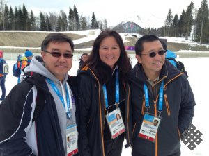 1) Александр Папын (слева) с Кэролайн Брилле и Генри Моком, представителями OBS – Олимпийской вещательной службы. Сочи, 16 марта 2014 года.