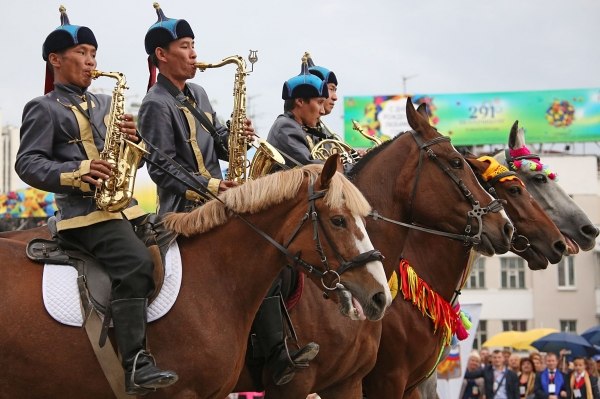 На праздновании Дня города Екатеринбурга в Историческом сквере Духовой оркестр Правительства Республики Тыва к 100-летию единения Тувы и России отдал дань памяти царю Николаю II, подписавшему Указ о принятии Тувы в протекторат Российской империи, продемонстрировав свое мастерство верхом на лошадях.